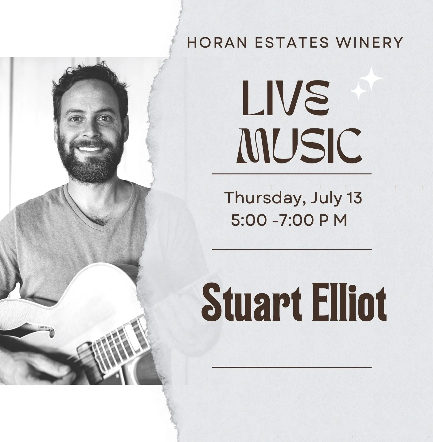 Join us for live music in the tasting room from 5:00 - 7:00 PM with featured musician Stuart Elliot. We will also have 20% off bottle purchases for Thirsty Thursday!
